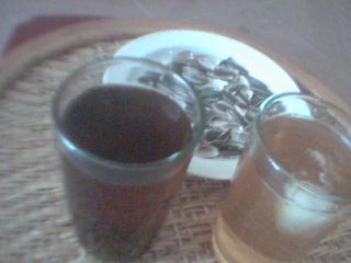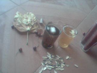 Có 3 cô gái xinh đẹp (cứ cho là thế đi vì Linh ko nhìn mặt) đến quán, gọi 3 cốc bb nóng, uống, chơi bài, tán phét, thanh toán tiền, đi về... để lại 3 cái cốc còn 1 ít bã và nước. Linh ra đổ hết vào... chai mang về đổ ra cái cốc này. Còn cái đĩa hạt bên cạnh í, may quá tối qua mẹ mang về 1 ít, sáng Linh dậy muộn đã thấy mất hết... nhân rồi, nhưng mà may quá, vì nó đã đc tách làm 2 nên nó nhiều gấp 2, lên ảnh vẫn ngon nhỉ.